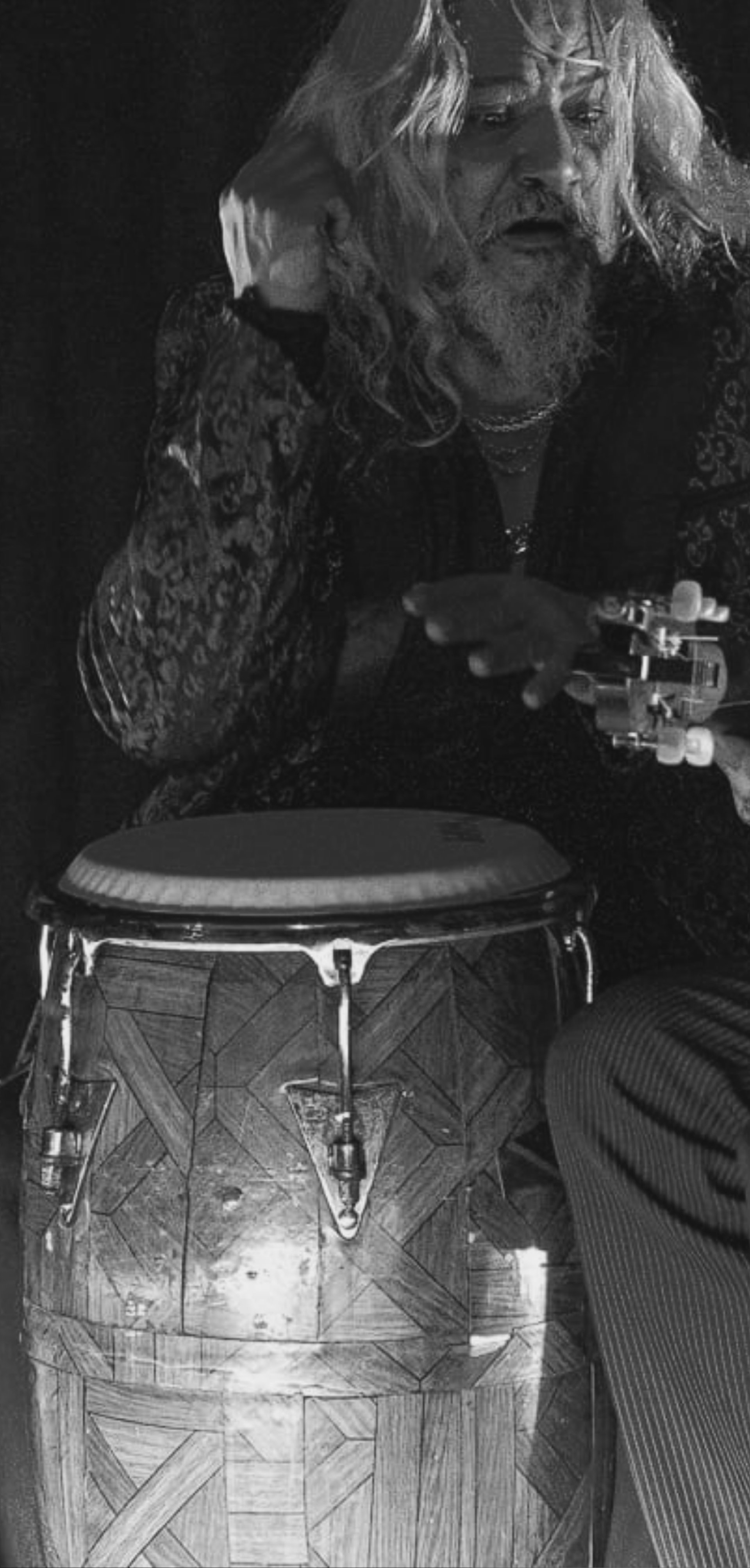 A penumbra se abre em um feixe de luz, revelando os guardiões da pureza, que fazem soar os tambores em toque africano.
